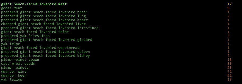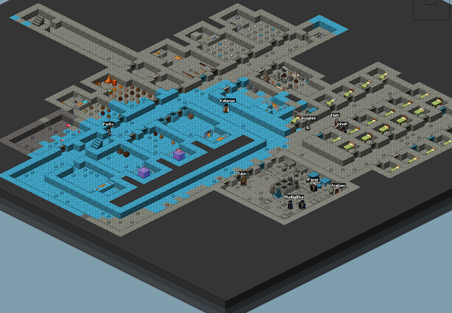 Entretanto, já inicio de outono, temos a primeira criança dwarf nascida no forte (uma das imigrantes recentes veio vinha já grávida) e encontramos uma caverna perto do nível -40. São boas notícias, pois esta caverna tem um lago de água límpida, que eu rapidamente aproveito, fazendo um poço no nível -37 que, usando cordas , roldanas e um balde, consegue então criar condições para termos um hospital a funcionar (não se podem limpar feridas com rum....ainda). Os imigrantes trazem consigo também uma série de galinhas, patos e porcos, então é decidido utilizar o solo da caverna (rico em fungos e ervas) para alimentar este gado e conseguir uma fonte renovável de ovos, leite e carne. Fantástico não?