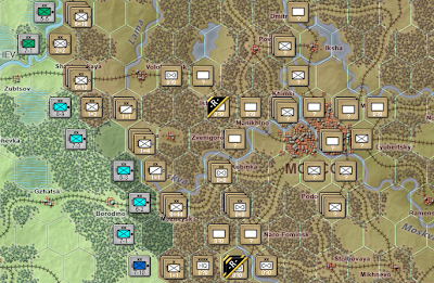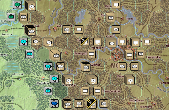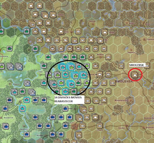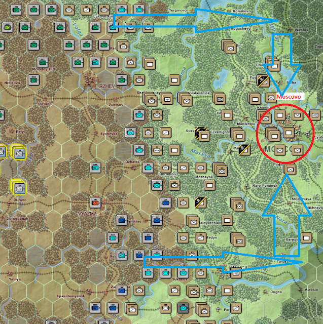No centro, estou a cerca de 90km de Moscovo, e está cada vez mais difícil avançar. O combustível demora a chegar aos panzer, e os soviéticos trazem cada vez mais infantaria para a linha de defesa, tendo agora linhas duplas de defesa (defesa em profundidade, para impedir avanços repentinos de panzer, que, com pouco combustível, pouco avançam) Coloquei os panzer a norte e sul de Moscovo, para obrigar os vermelhos a deslocar tropas para os flancos. Se não avançar pelo centro, avanço pelos flancos e obrigo a capitulação de Moscovo pela fome.