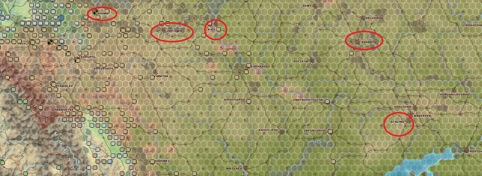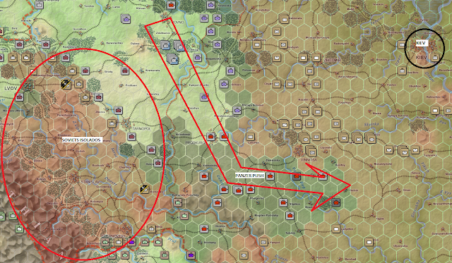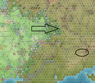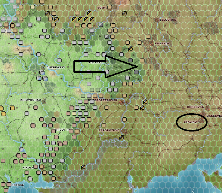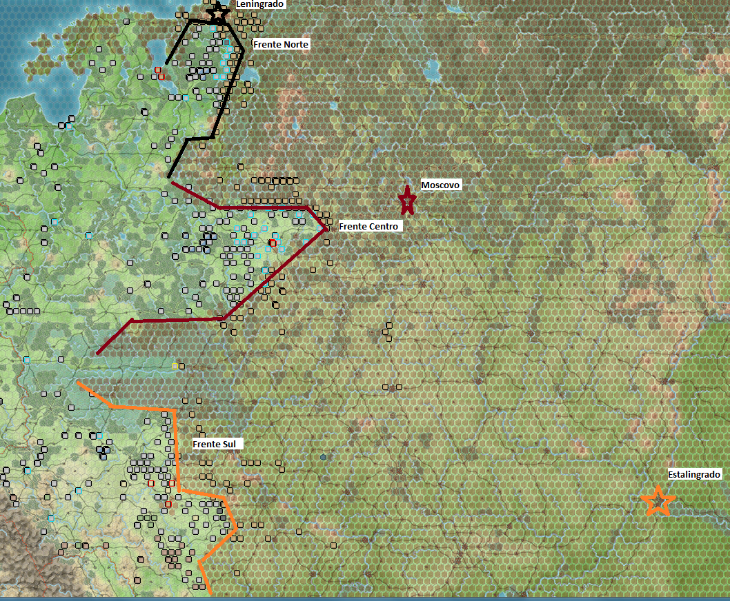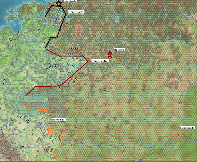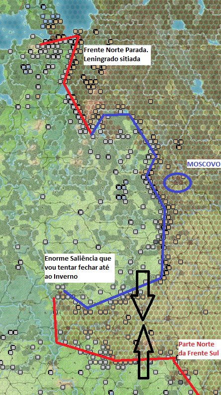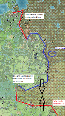 frente Sul tenho novidades. Desloquei 4 divisões panzer do centro e norte para aqui. Mas não só. Deixei o extremo sul a ser controlado pelos aliados Romenos e Húngaros (com 3 ou 4 divisões alemãs para dar algum poder de impacto a este sector), mas consegui assim focar as divisões alemãs para apoiar os panzer e fazer uma enorme ferida na linha soviética. Ameaço Kiev pelo sul agora. Mas não só, o grosso da produção de t-34 soviético ainda se encontra em Kharkov(60 tanques - POR SEMANA!), e nos próximos dias aposto que vai ser o pânico do lado soviético para tentar retirar o máximo de maquinaria e indústria de lá. Levarão alguns meses até, algures para a sibéria, resumirem a produção. A sul de Kharkov, o meu objectivo (real) para este inverno. Stalino. Mais a este, ainda como miragem, Estalingrado.
