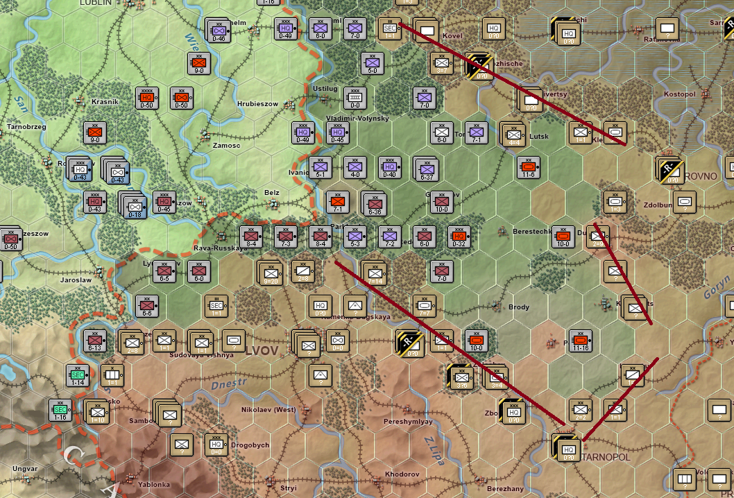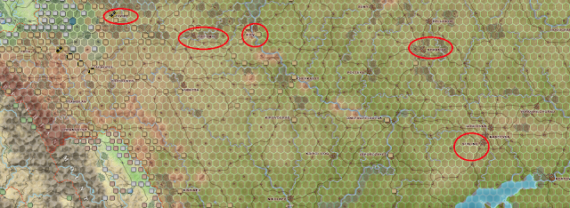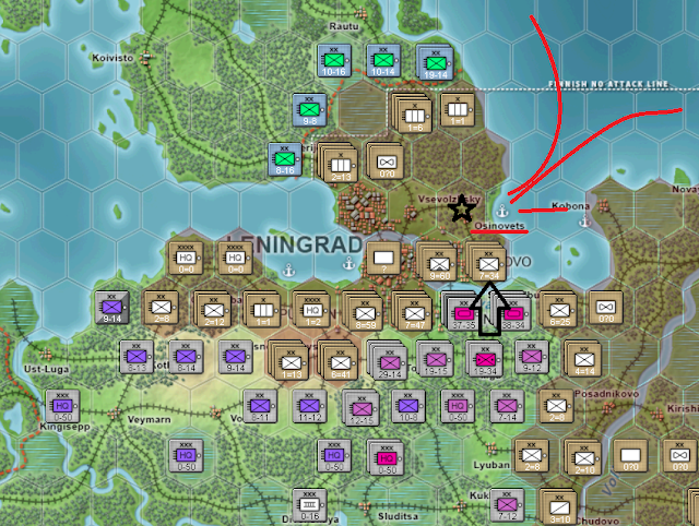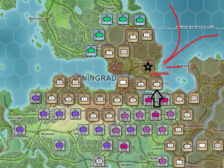 Leningrado está cercada por terra, perdendo toda e qualquer ligação terrestre por Sul. A norte, os meus (maus) aliados finlandeses recusam-se, por decisão política, a atacar, mantendo apenas posições e impedindo mantimentos de chegarem à cidade por terra. Leningrado está suspensa pelo porto de Osivonets. Tomo aquele porto, e os defensores ficam sem balas, sem comida, e sem combustível. Vou apostar tudo para atravessar o istmo e tomar o porto.